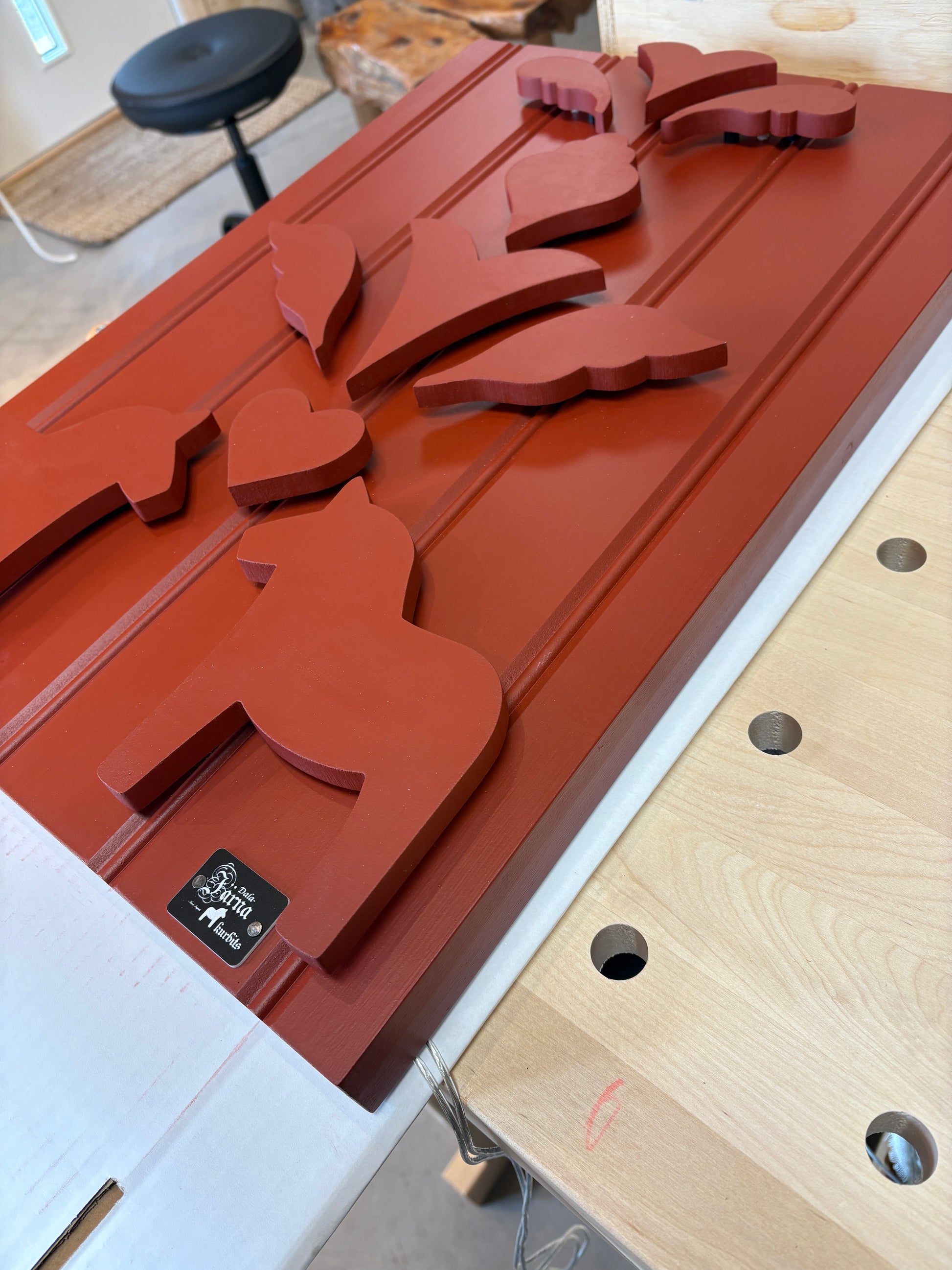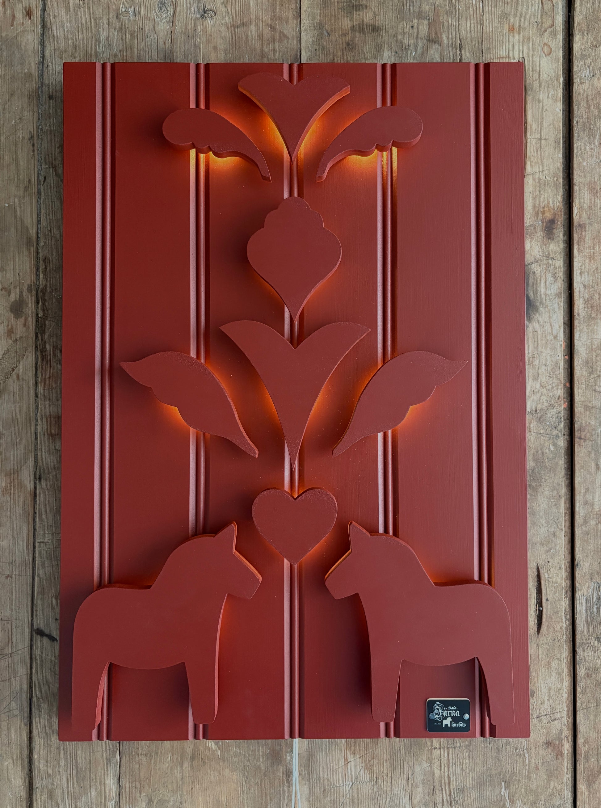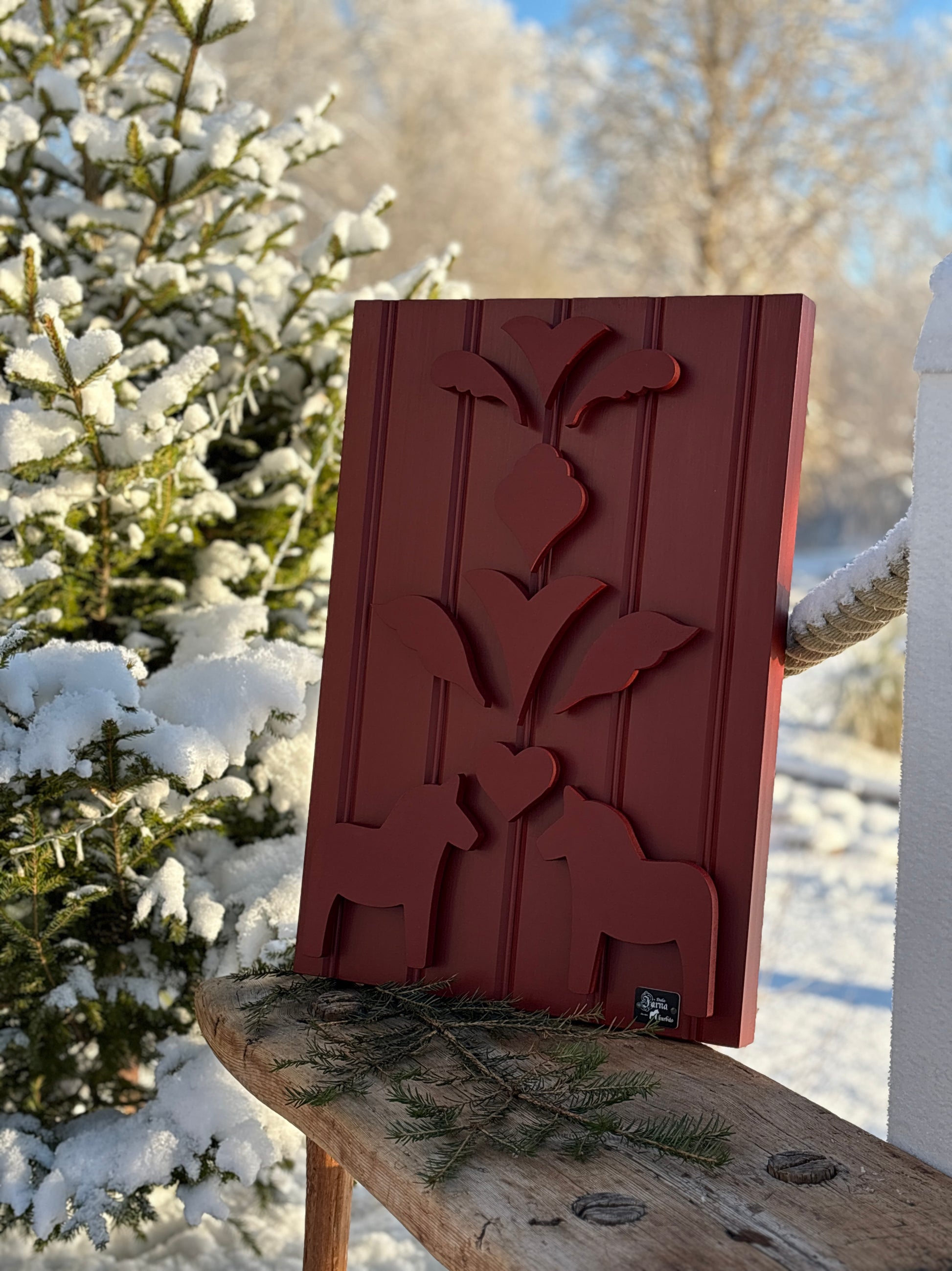Denna unika väggdekoration i trä är en hyllning till svensk hantverkstradition och folkkonst. Tavlan är handmålad och har utskurna motiv inspirerade av den klassiska kurbitsstilen och ger en tidlös och harmonisk känsla som passar perfekt i både moderna och lantliga hem.