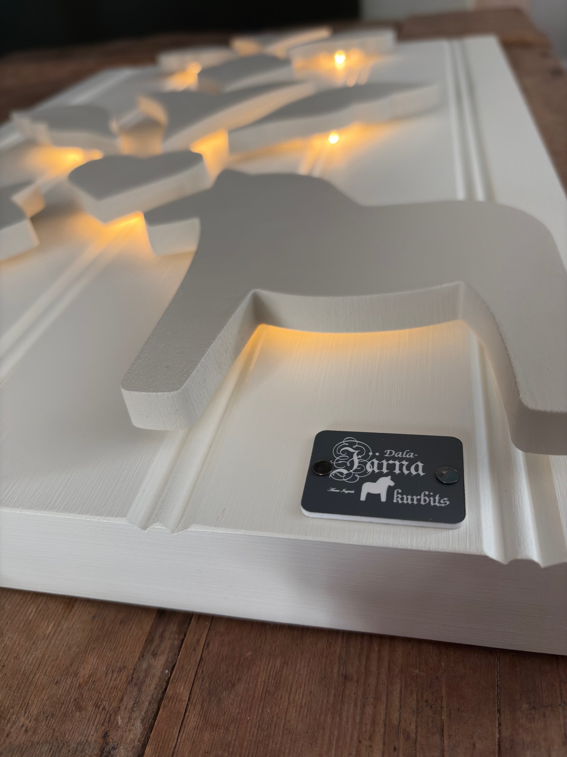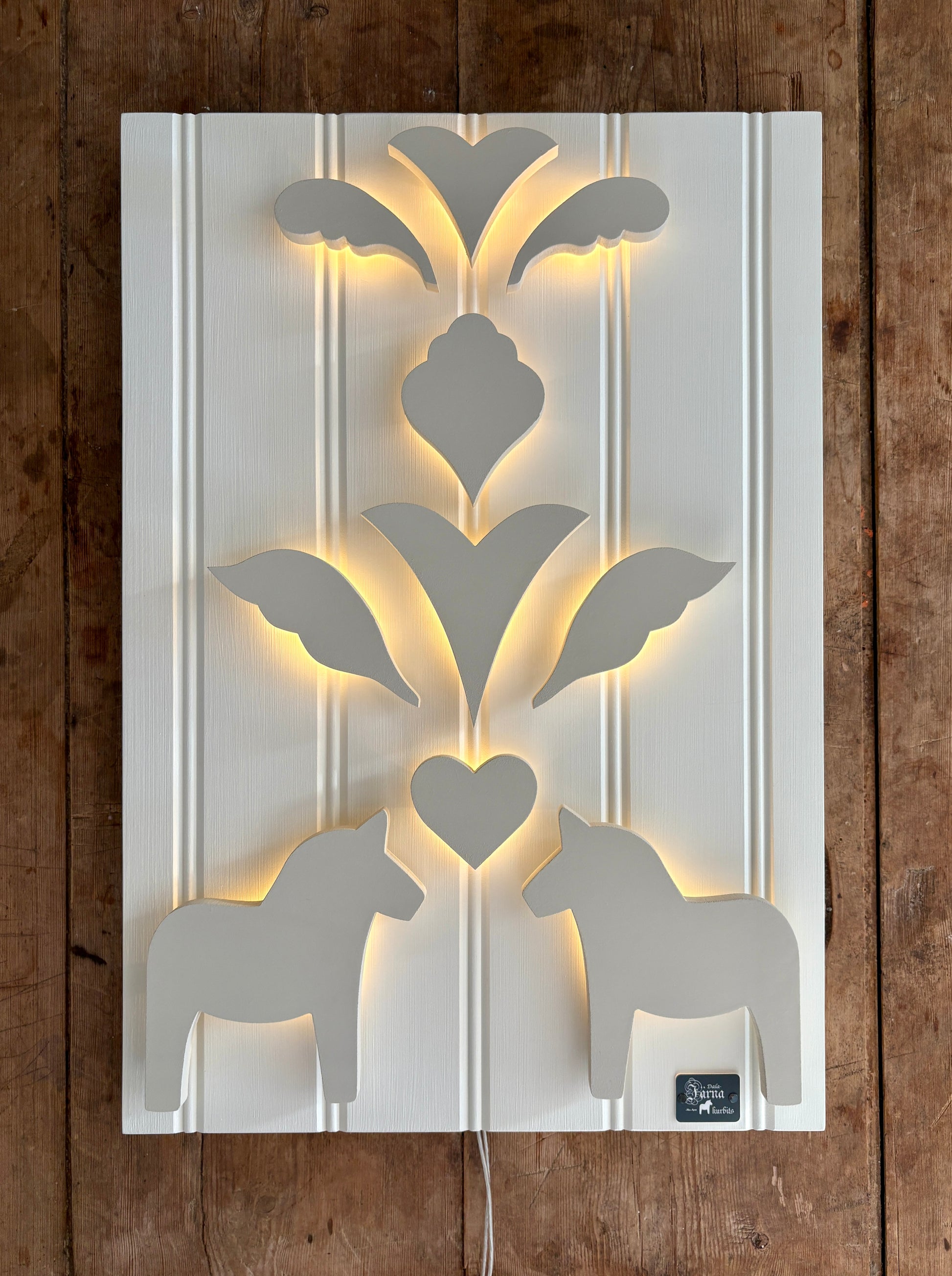 Den inbyggda LED-belysningen bakom de utskurna detaljerna ger ett mjukt och stämningsfullt ljus, vilket skapar en varm och inbjudande atmosfär i rummet. Ljuset framhäver de handmålade detaljerna och ger djup och karaktär åt designen.